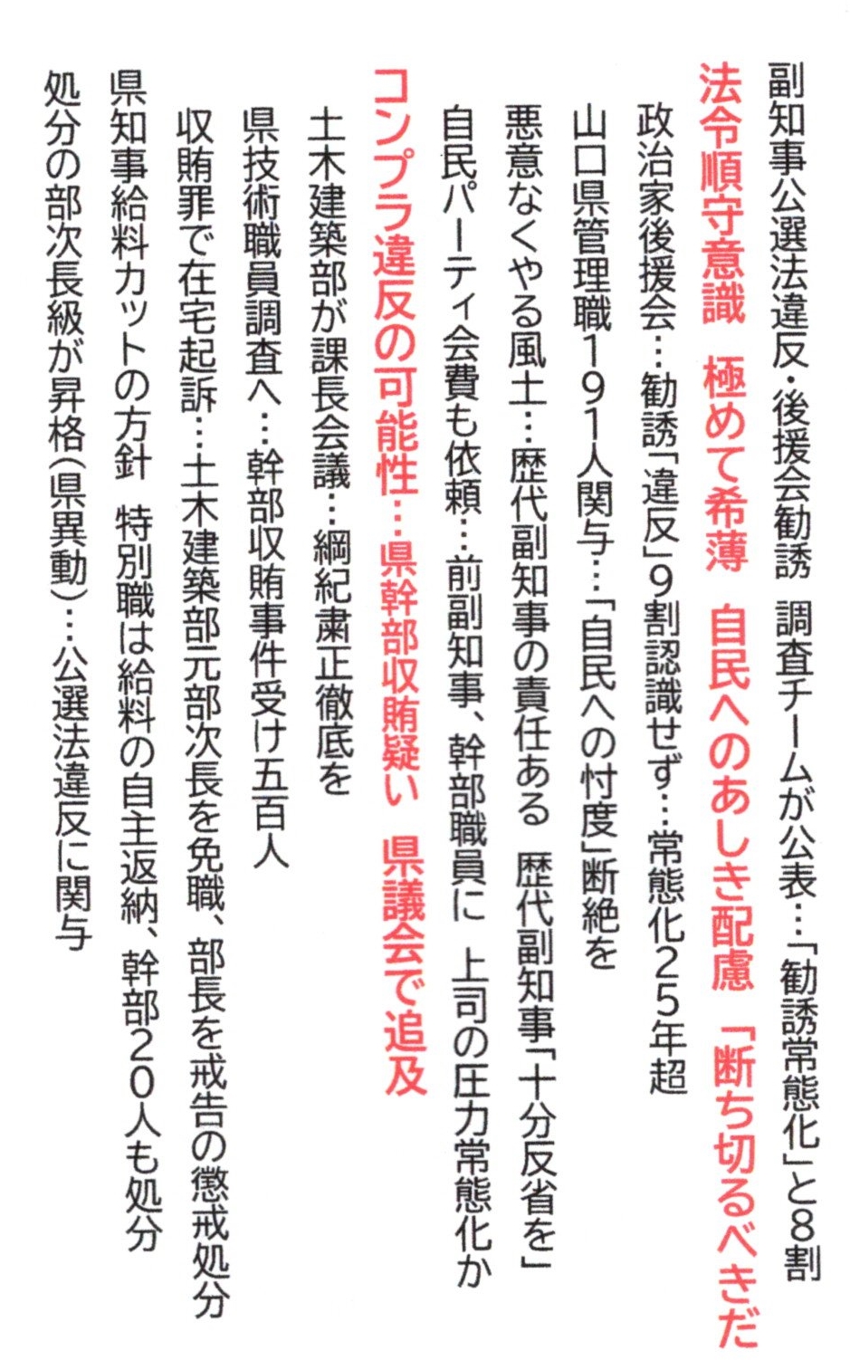 ▼3月14日の土木建築委員会で、幹部職員の不正行為について…「昨年10月に、『改正公益情報通報者保護法に基ずく指針の解説』が公表され、1月4日付けの政令で、改正法の施行期日が6月1日に決定されている。また、『山口県建設工事等発注事務に関するコンプライアンス要綱』もあるではないかと指摘し、部として、今回の件を、いつ誰から、どのように知らされたのか、知ったのか?業者との間に介在したとされる人物とは、いかなる人物なのか?などを質す」