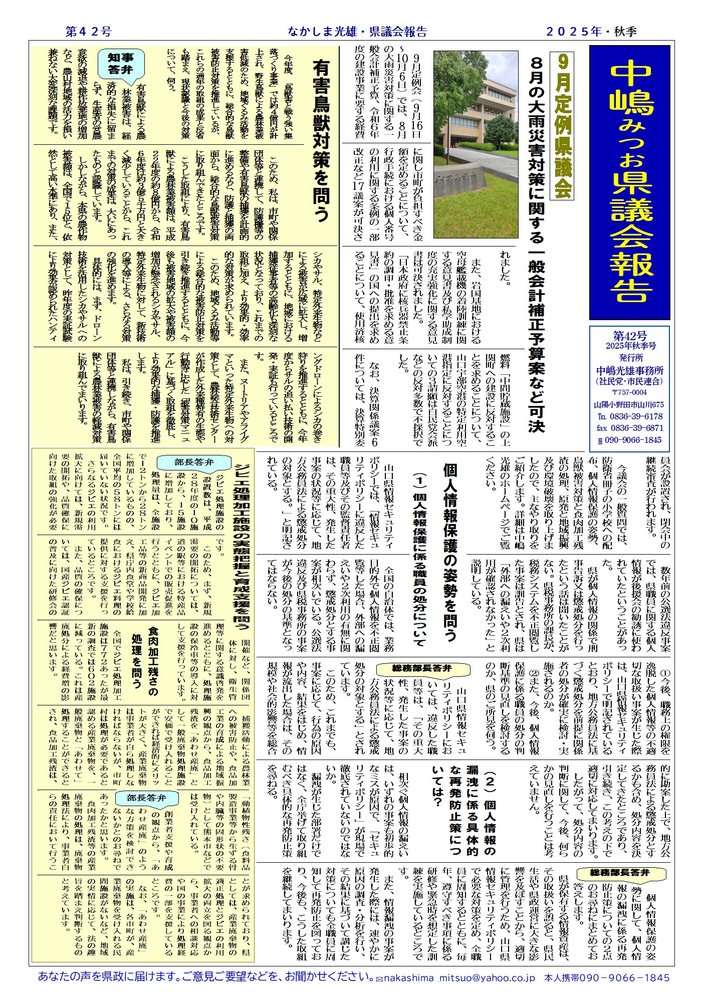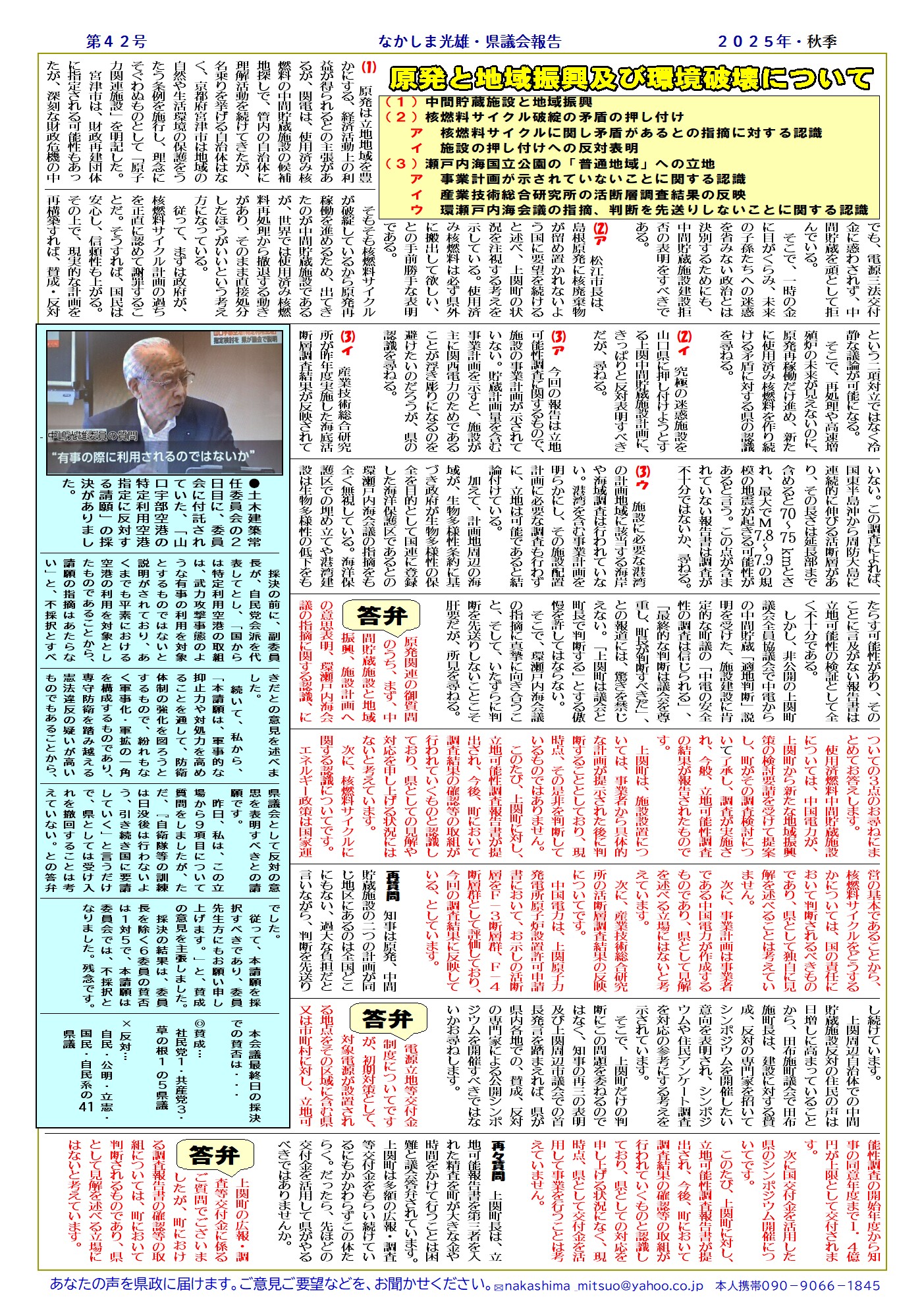 25年9月県議会報告ニュース(第42号) 2025年12月16日 に nakashima が投稿 1、防衛省冊子の小学校への配布について 2、県の個人情報保護の姿勢について 3、鳥獣被害対策について。 4、原発と地域振興及び環境破壊について (1)中間貯蔵施設と地域振興 (2)核燃料サイクル破綻の矛盾の押し付け (3)瀬戸内海国立公園の「普通地域」を核のゴミ捨て場に? Tweet