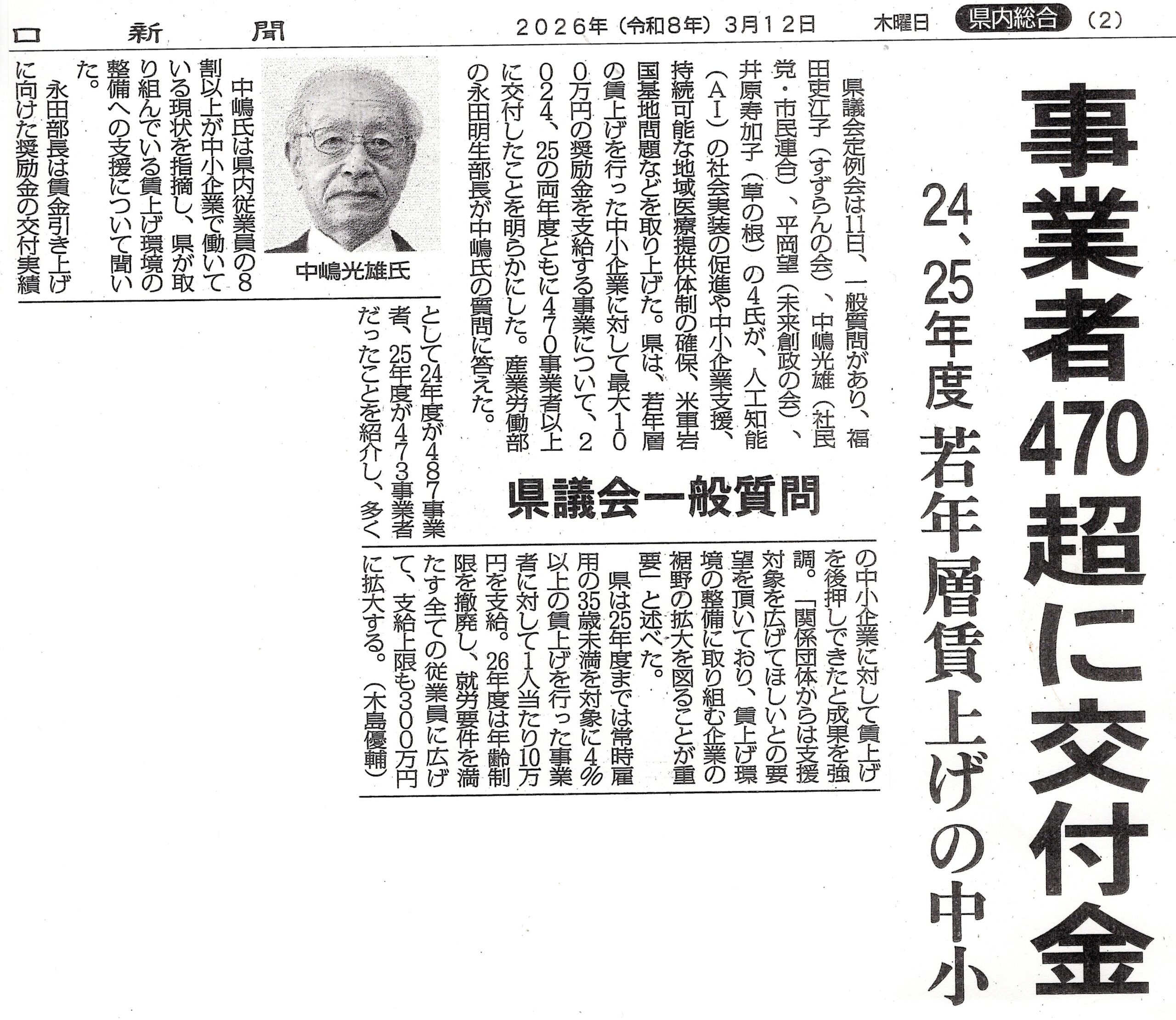 そこで、新年度予算において、賃上げ環境の整備への支援として、平均4%以上の賃上げを実施した中小企業等への奨励金の支給、1社あたり最大300万円。これはR7年度の100万円より拡充されており評価しますが、これまでの制度創設からの制度利用企業の推移と評価、課題はどうであったのか?伺います。